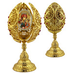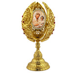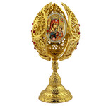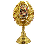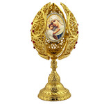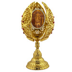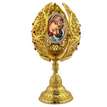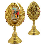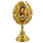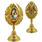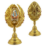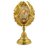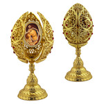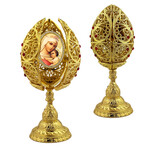 M-39-31 Faberge Style Filigree Icon Egg - Triptych With Hanging Framed Icon Inside - Virgin of Extreme Humility - Decorated With Faux Crystals - 6 Inch Tall