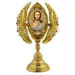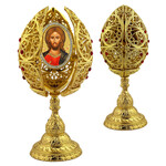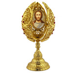 M-39-29s Faberge Style Filigree Icon Egg - Triptych With Hanging Framed Icon Inside - Christ - Decorated With Faux Crystals - 6 Inch Tall