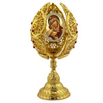 M-39-18s Faberge Style Filigree Icon Egg - Triptych With Hanging Framed Icon Inside - Virgin of Vladimir - Decorated With Faux Crystals - 6 Inch Tall
