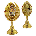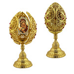 M-39-11s Faberge Style Filigree Icon Egg - Triptych With Hanging Framed Icon Inside -Virgin of Kazan - Decorated With Faux Crystals - 6 Inch Tall