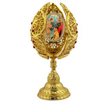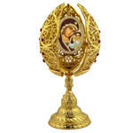 M-39-7 Faberge Style Filigree Icon Egg - Triptych With Hanging Framed Icon Inside -Virgin of Jerusalem - Decorated With Faux Crystals - 6 Inch Tall