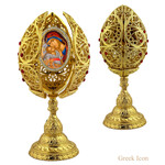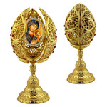 M-39-16s Faberge Style Filigree Icon Egg - Triptych With Hanging Framed Icon Inside -Virgin of Vladimir - Decorated With Faux Crystals - 6 Inch Tall