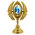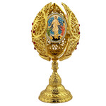 M-39-23S Faberge Style Filigree Icon Egg - Triptych With Hanging Framed Icon Inside - Perpetual Help Icon Virgin Mary With Crown - Decorated With Faux Crystals - 6 Inch Tall