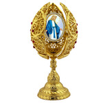 M-39-35s Faberge Style Filigree Icon Egg - Triptych With Hanging Framed Icon Inside -Our Lady of Grace- Decorated With Faux Crystals - 6 Inch Tall