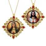 M37-22-71 Immaculate Heart of Mary & Sacred Heart of Jesus Icon Christmas Ornaments - Icons Set In a Jeweled Frame, Decorated With Faux Crystals, 4 Inch - Set of 2