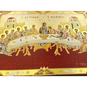 XX4531 Last Supper - Gold Gilded Byzantine Greek Icon - in Wooden Frame Decorated With Crosses Comes With Stand For Standing and Hook For Hanging on Wall 7 1/4"x5 3/4"