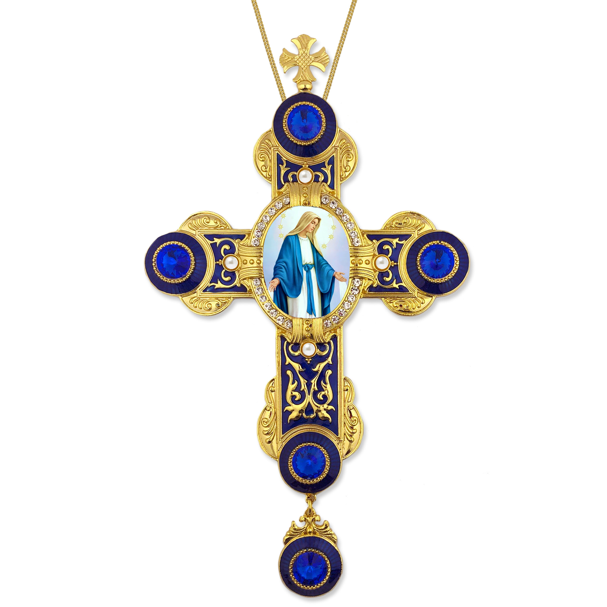Inspired after a traditional lobed Greek styled Cross this Cross with its blue enamel and crystals conveys the peace we find in Christ’s creation as well as in God’s creation of the sea and sky!