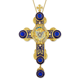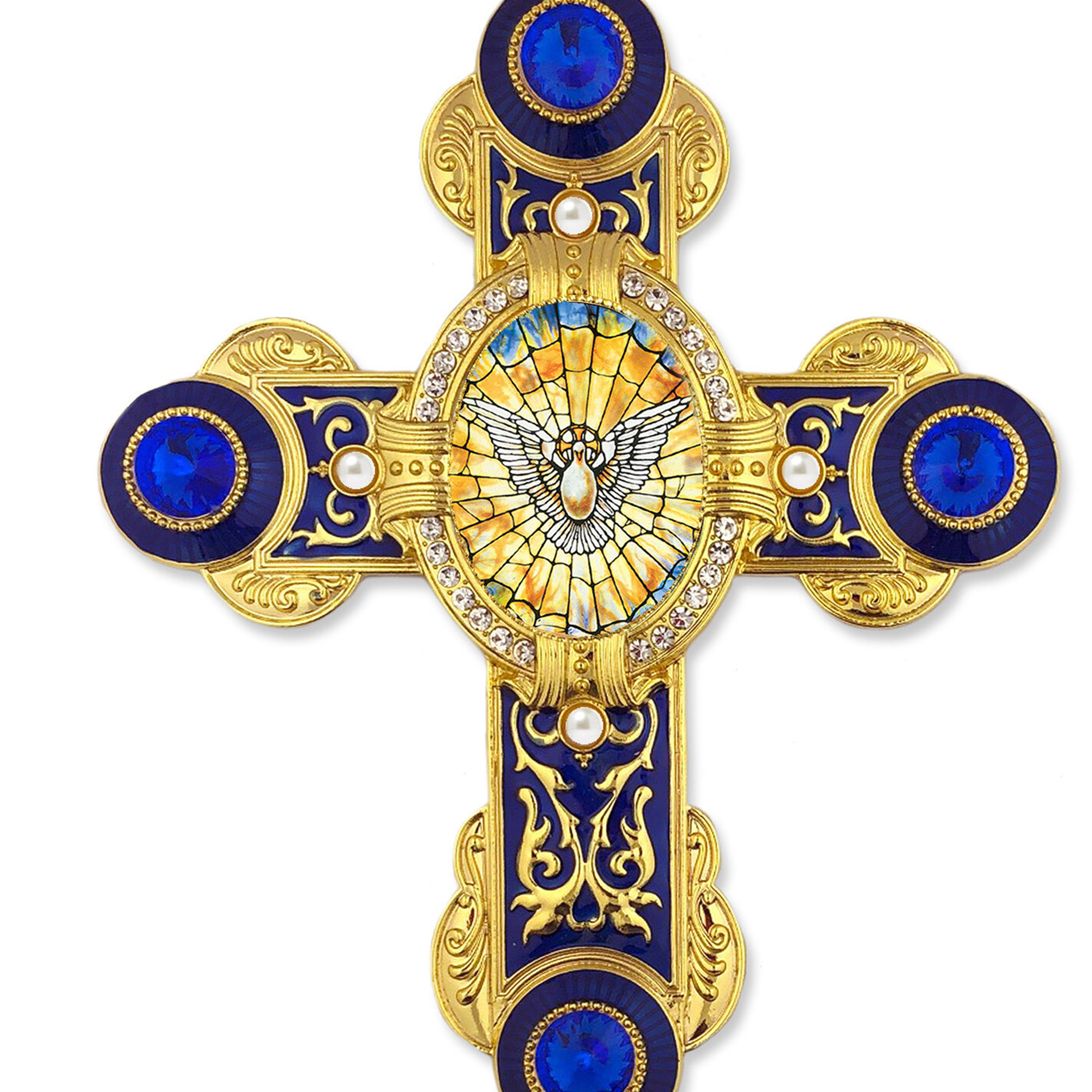 This Greek-styled design with blue enamel and crystals conveys the peace found in Christ’s creation, echoing the calming hues of sky and sea.