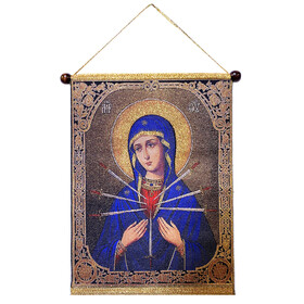 The icon depicts the Virgin alone with heart pierced with seven swords – three from the left side, three from the right side and one from below.  The swords symbolizing the sorrow that Mary felt while seeing her Son suffering.