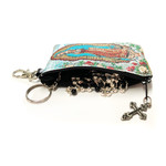 CP-15 Tapestry Cloth Key Chain Coin Rosary Holder Case Pouch Turquoise With Red 4 3/4 Inch Width