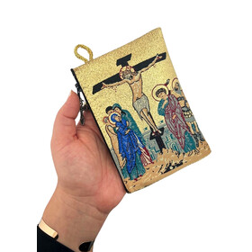 This beautiful tapestry pouch features the traditional Byzantine icon of the Crucifixion. On one side, you will find Christ on the Cross, surrounded by His Mother, female followers, St. John the Beloved, and the Roman Guard who converted to Christianity.