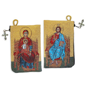 BYZANTINE STYLED REVERSIBLE MATCHED ICONS OF CHRIST PANTOCRATOR AND THE VIRIGN AND CHRIST CHILD ON A GOLD FIELD TAPESTRY POUCH.