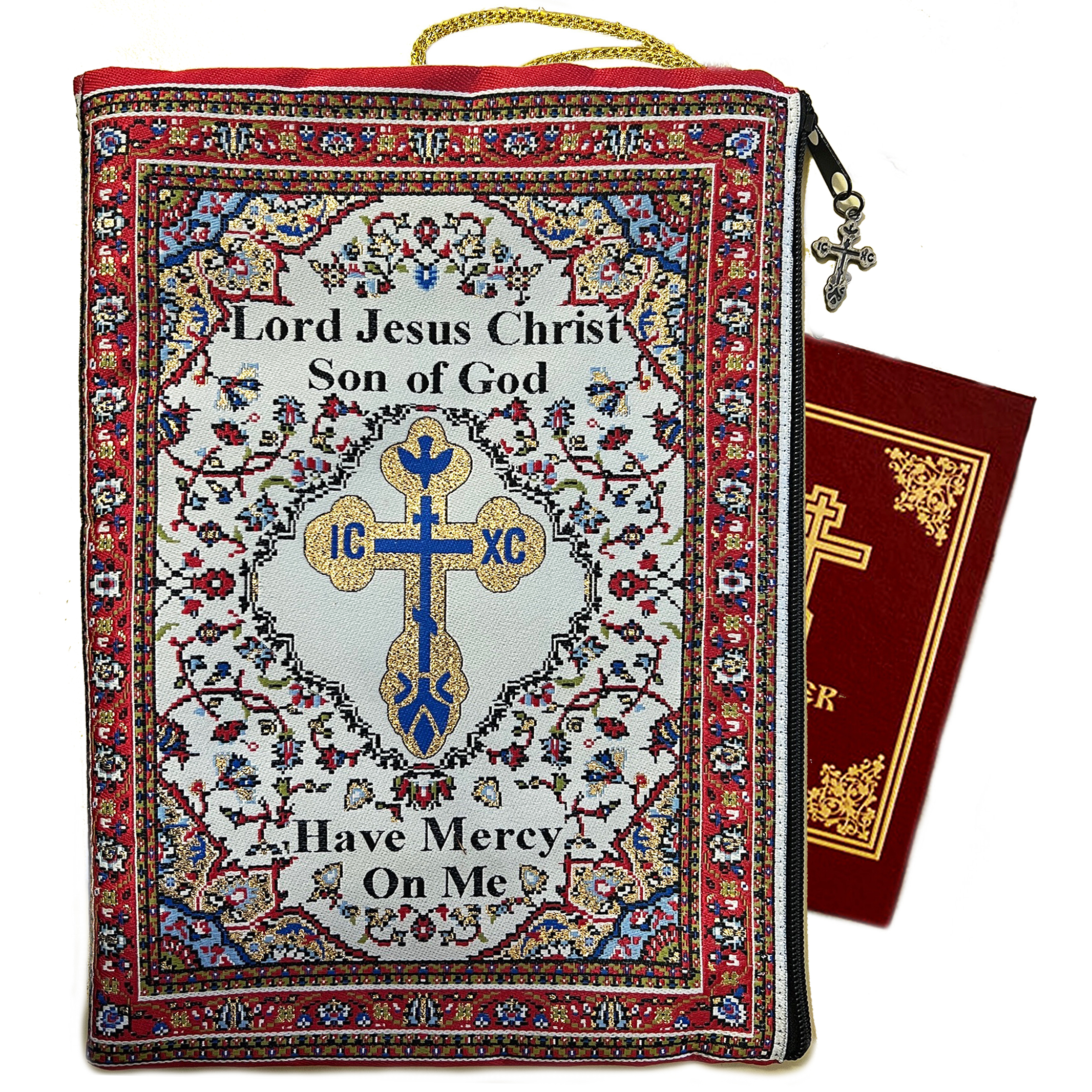 Bible not included - High quality tapestry pouch case - With three bar cross and dove above the cross symbolizes Holy Spirit