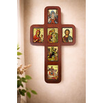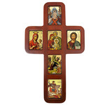 WC3-15 Greek Byzantine Icon Wall Cross - 14 Inch Oak Wood - Icons are Authentic Greek Gold Foiled - Seven Swords, Saint George, Saint Nicholas, Saint Michael, Sweet Kissing, Christ The Teacher
