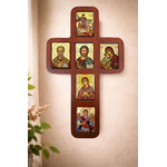 WC3-13 Greek Byzantine Icon Wall Cross - 14 Inch Oak Wood - Icons are Authentic Greek Gold Foiled - Nativity of Christ, Holy Family, Saint Nicholas, Michael