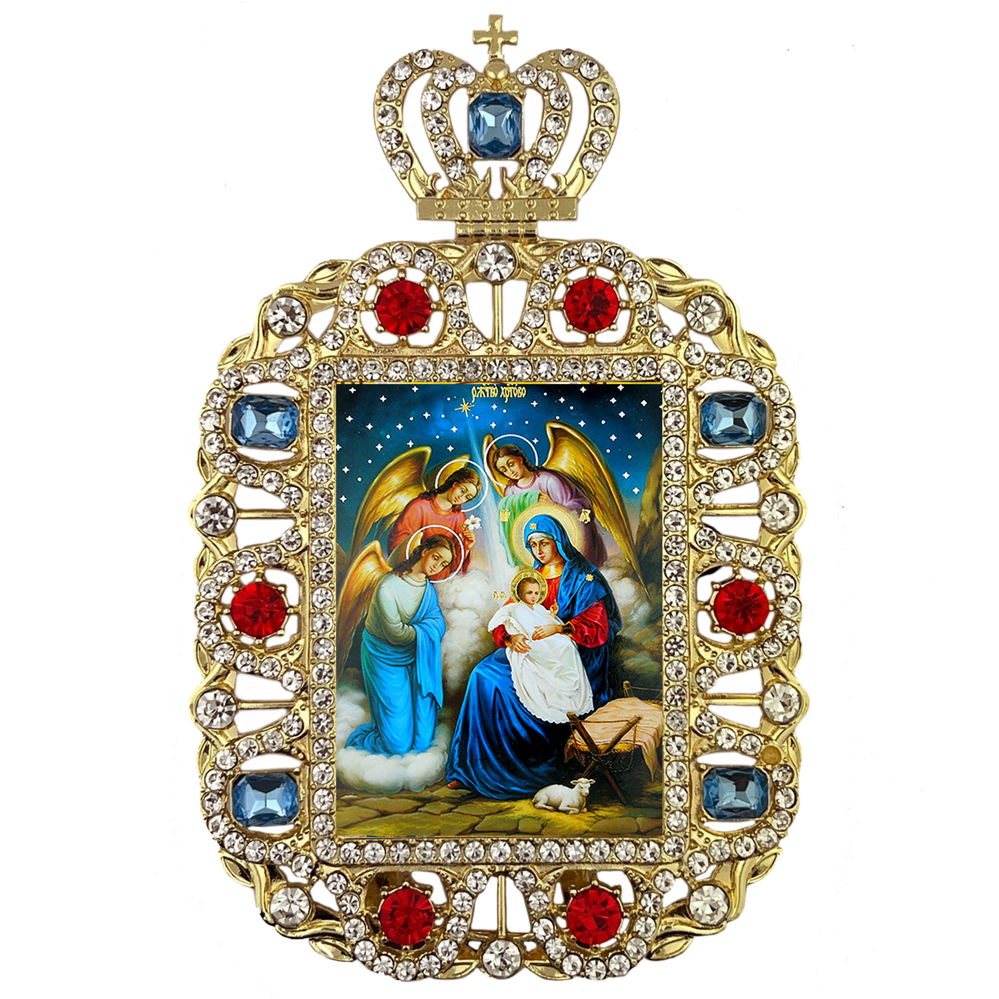 M-35-NA Nativity of Christ Angels Icon Gold Foil in Jeweled Frame With Crown and Cross - With its Stand and Small Chain for Hanging - Gift Boxed - Orthodox Catholic Icon