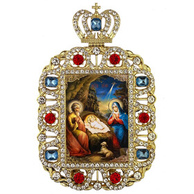 M-35-68 Nativity of Christ Icon Gold Foil in Jeweled Frame With Crown and Cross - With its Stand and Small Chain for Hanging - Gift Boxed - Orthodox Catholic Icon