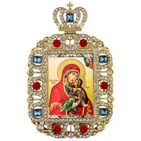M-35-A Saint Ann Gold Foil Icon - Jeweled Framed With Crown and Cross - With its Stand and Small Chain for Hanging - Gift Boxed