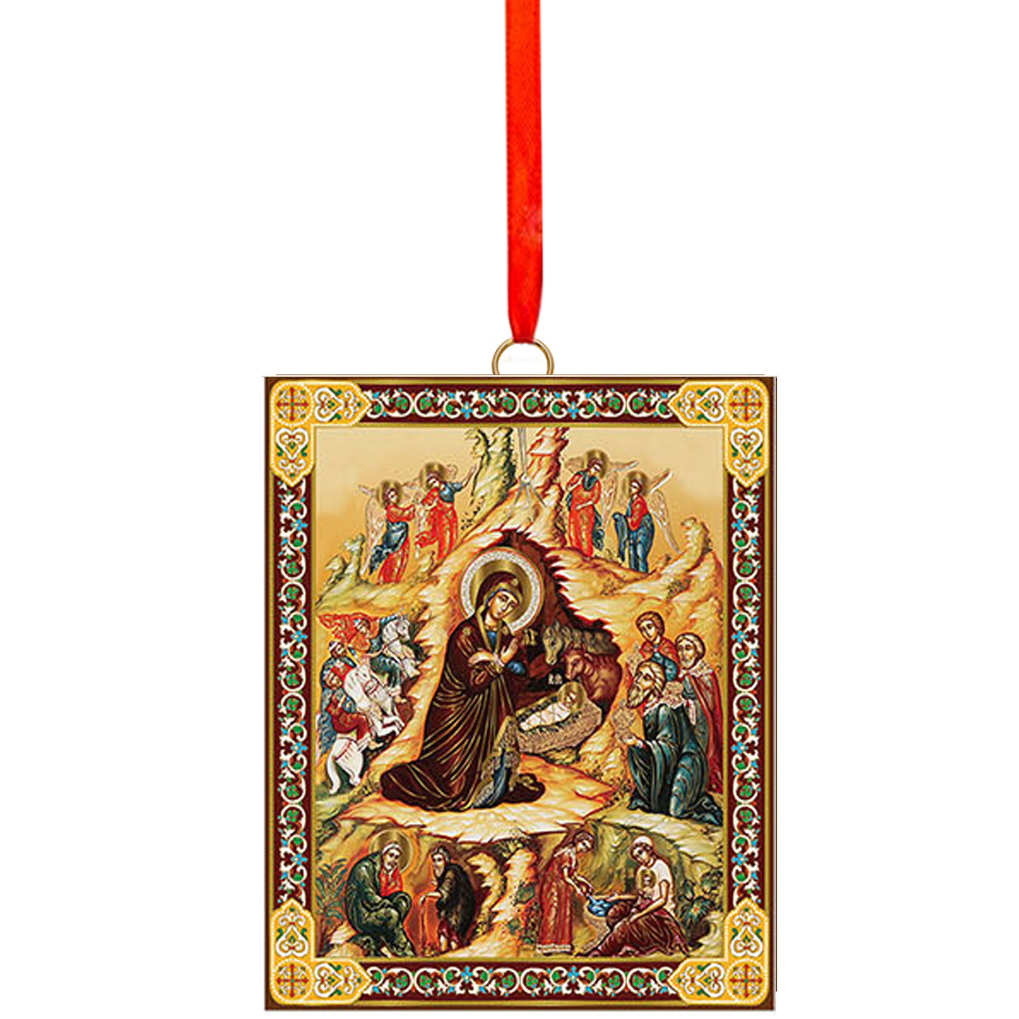 J-O-2 Nativity of Christ Wooden Icon Ornament - 2 Sided - With Red Ribbon - Gold Foil Icon Mounted on Wood