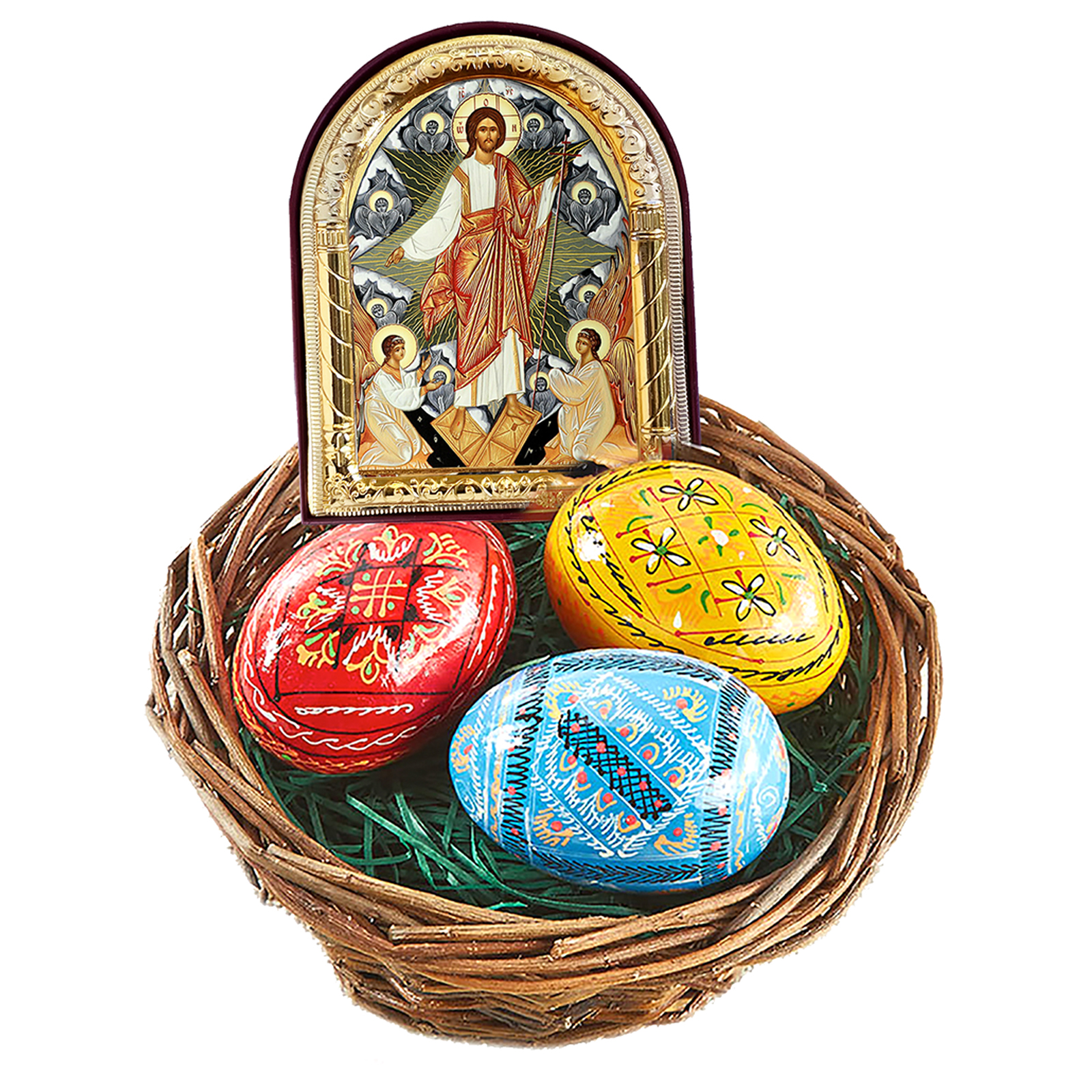 1. Basket with 3 pysanky Easter eggs - size of each egg 2 1/4 inch