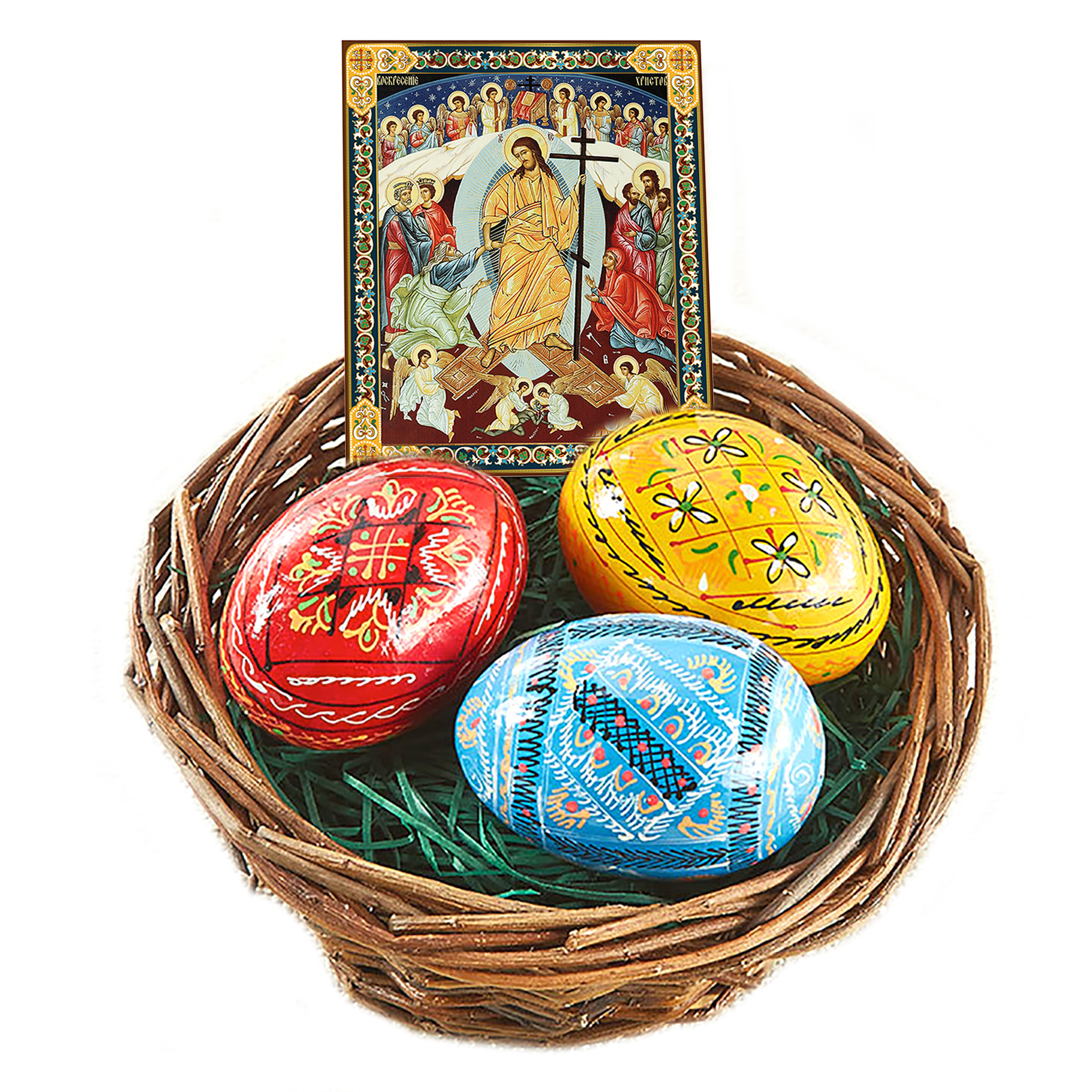 1. Basket with 3 hand painted pysanky easter eggs - size of each egg 2 1/4 inch
