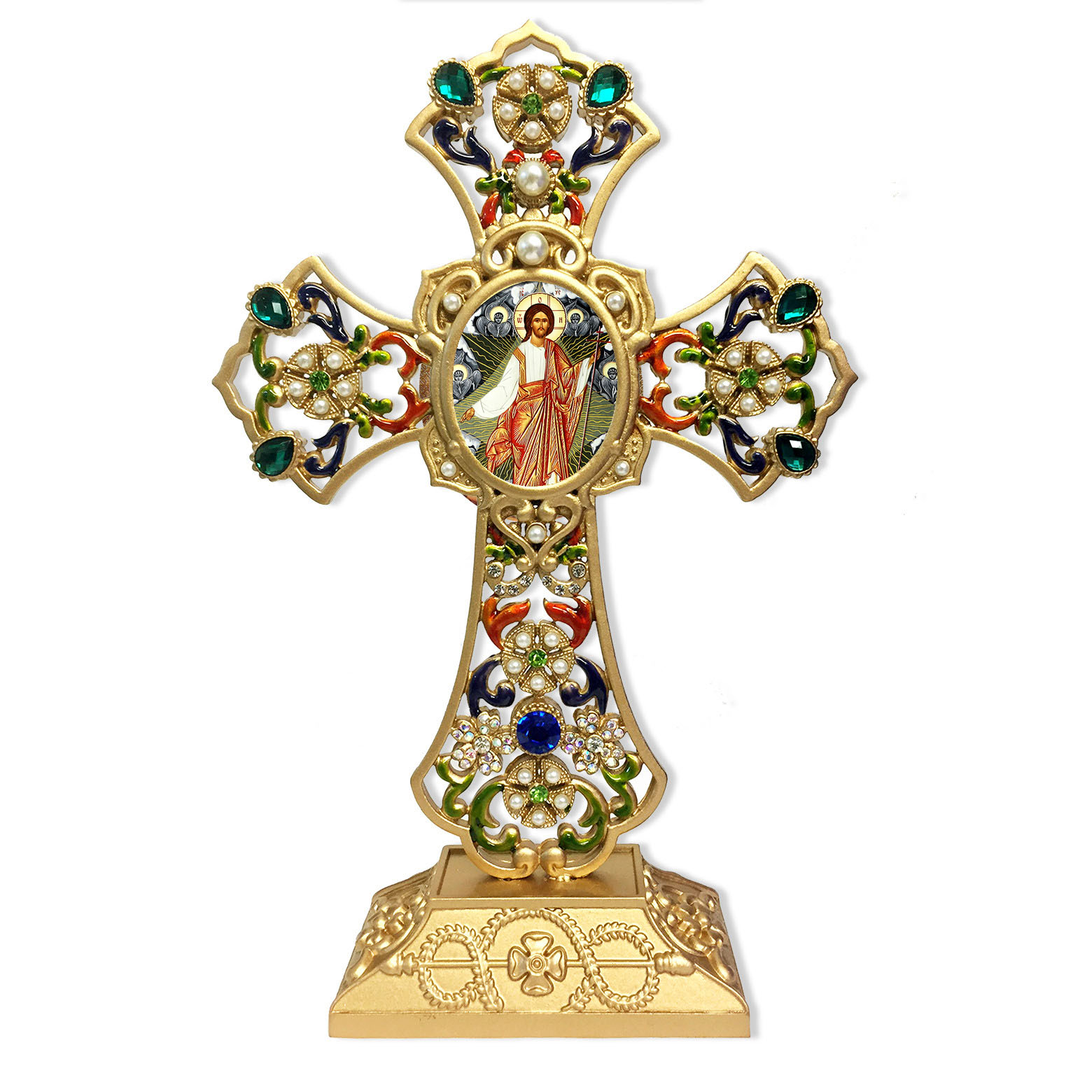 • Filigree Standing Jeweled Icon Cross with Resurrection of Christ Icon - 8 5/8 Inches