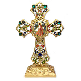 CR-7-31 Filigree Standing Jeweled Icon Cross With Icon Resurrection of Christ Icon Seraphim Angels - Decorated with Faux Pearls 8 5/8 Inch
