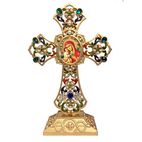 CR-7-5 Standing Jeweled Cross With Icon Madonna & Child 8 5/8 Inch