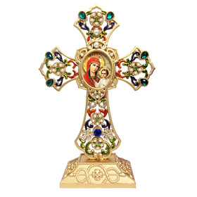 CR-7-79 Standing Jeweled Cross With Icon Virgin Mary & Christ 8 5/8 Inch