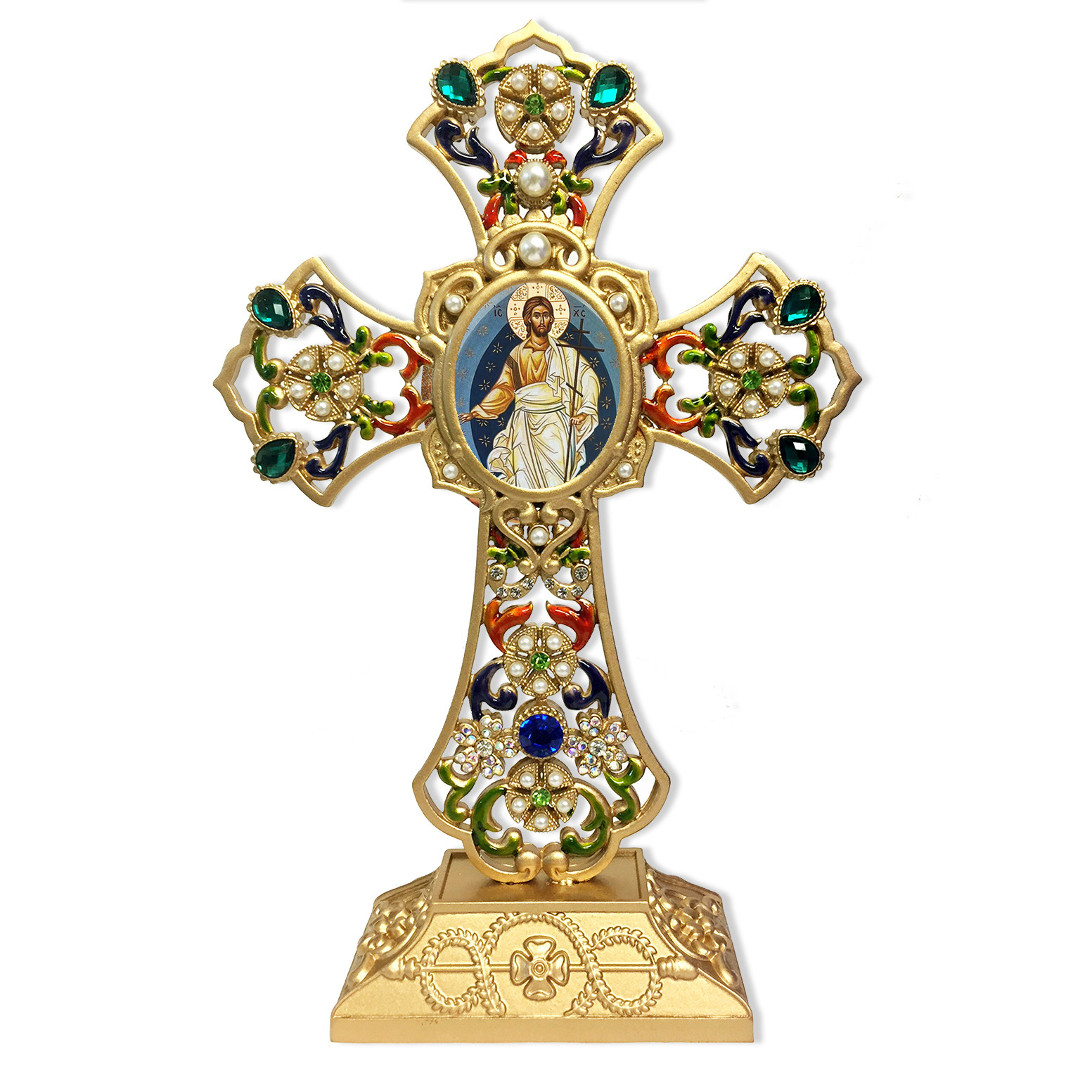 • Filigree Standing Jeweled Icon Cross with Resurrection of Christ Icon - 8 5/8 Inches