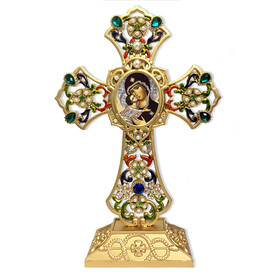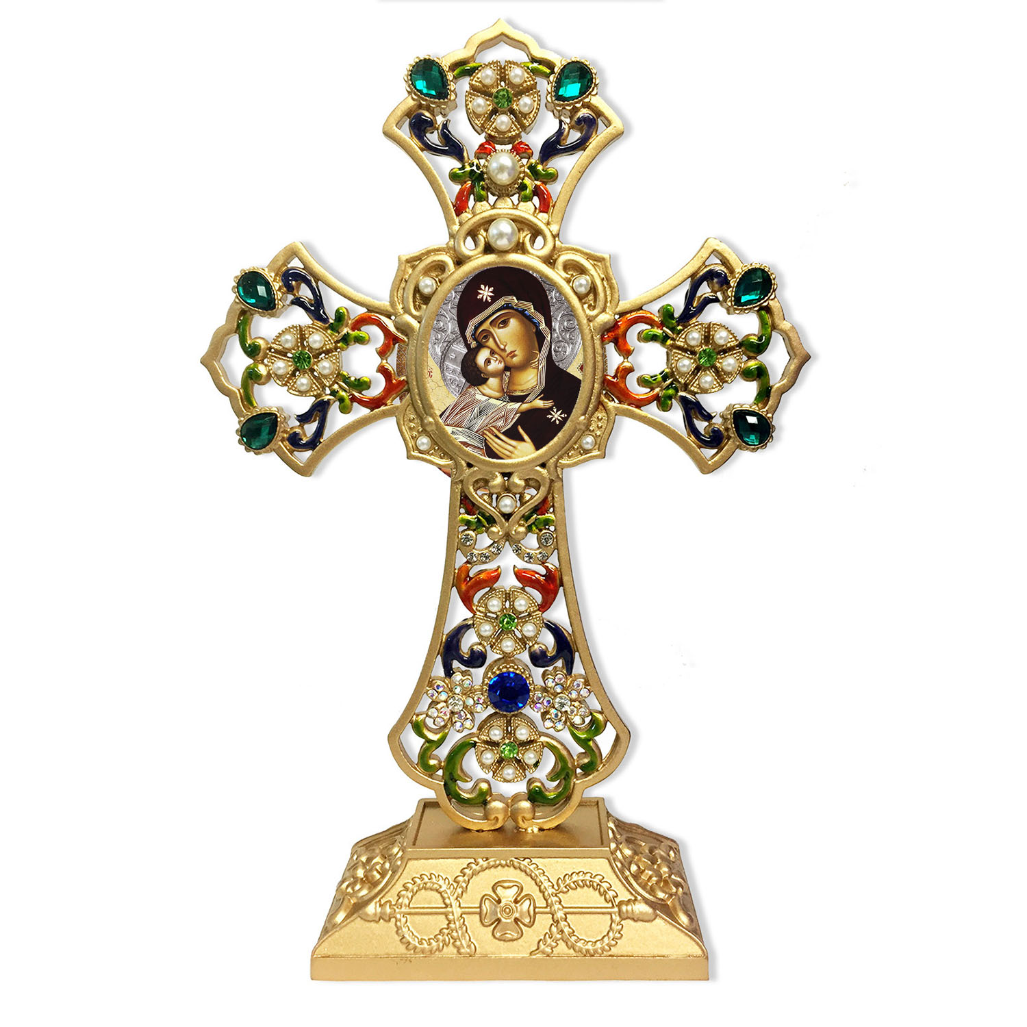CR-7-16 Virgin of Vladimir Byzantine Icon Filigree Standing Jeweled Cross - Decorated with Faux Pearls 8 5/8 Inch