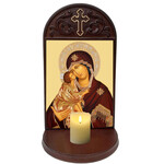 SH102 Virgin of Vladimir Gold Foil Icon Wooden Shrine With Rosary, Candle and Holy Water Bottle Holder 8.4 inch tall
