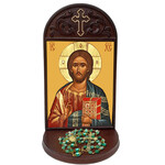SHX5223 Christ Blessing - Byzantine Greek Icon - Gold Gilded Icon in Wooden Shrine With Rosary, Candle and Holy Water Bottle Holder 8.4 inch tall