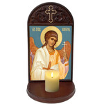 SH105 Wooden Prayer Shrine Guardian Angel Gold Foil Icon With 3 Inch Deep Shelf to Place Rosary, Candle, Prayer Request or Holy Water Bottle Holder 8 1/2 Inch Tall