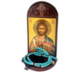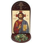 SHX5223 Christ Blessing - Byzantine Greek Icon - Gold Gilded Icon in Wooden Shrine With Rosary, Candle and Holy Water Bottle Holder 8.4 inch tall
