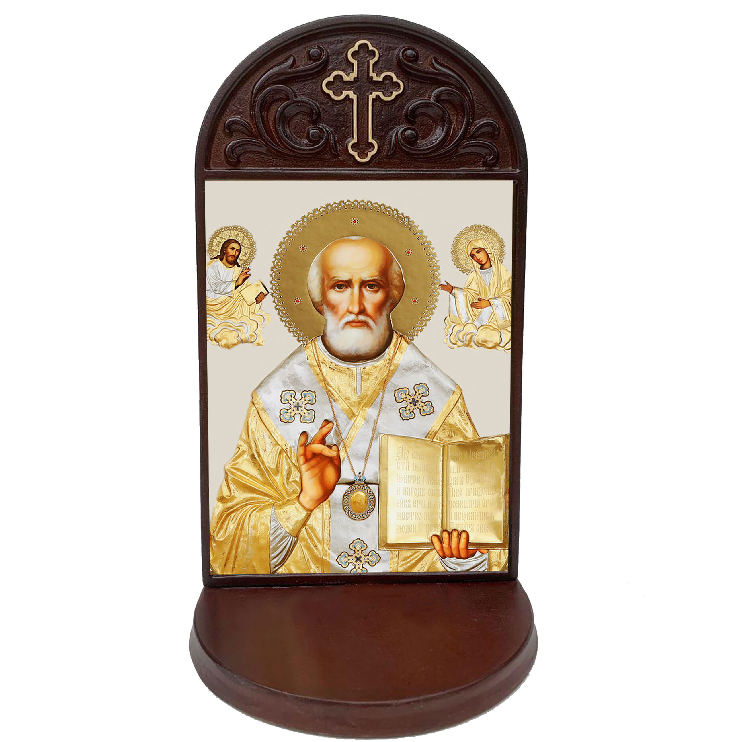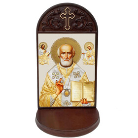 SH-115 Wooden Shrine Gold Foil Saint Nicholas Icon - Shrine Wooden Prayer Shrine With 3 Inch Deep Shelf to Place Rosary, Prayer Request, Candle and Holy Water Bottle Holder 8 1/2 inch tall