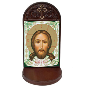 SH89 Jesus Christ Made Without Hands Holy Face Veronica's Veil Icon in Wooden Prayer Shrine With 3 Inch Deep Shelf to Place Rosary, Prayer Request, Candle and Holy Water Bottle Holder 8 1/2 inch tall