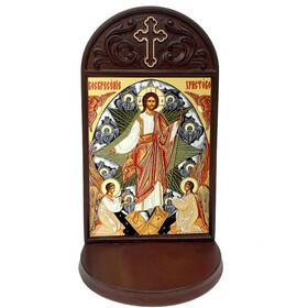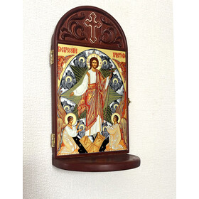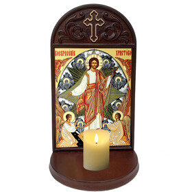 SH31 Resurrection Of Christ Icon With 6 Seraphim Angels in Wooden Shrine With 3 Inch Deep Shelf to Place Rosary, Prayer Request, Candle and Holy Water Bottle Holder 8 1/2 inch tall