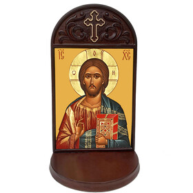 SH97 Wooden Shrine Gold Foil Christ The Teacher Icon - Shrine Wooden Prayer Shrine With 3 Inch Deep Shelf to Place Rosary, Prayer Request, Candle and Holy Water Bottle Holder 8 1/2 inch tall