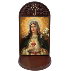 SH71 Immaculate Heart of Mary Sacred Heart Icon in Wooden Shrine With 3 Inch Deep Shelf to Place Rosary, Prayer Request, Candle and Holy Water Bottle Holder 8 1/2 inch tall