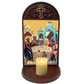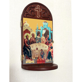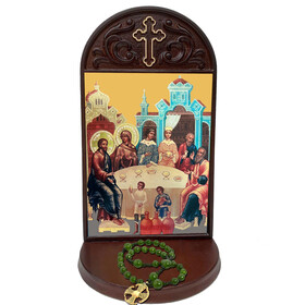 SH83 Wedding in Cana Icon in Wooden Shrine With 3 Inch Deep Shelf to Place Rosary, Prayer Request, Candle and Holy Water Bottle Holder 8 1/2 inch tall