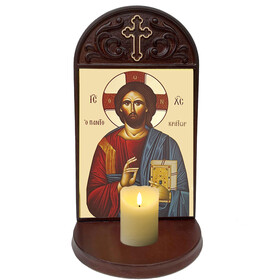 SHX5223 Christ Blessing - Byzantine Greek Icon - Gold Gilded Icon in Wooden Shrine With Rosary, Candle and Holy Water Bottle Holder 8.4 inch tall