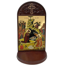 SHX4546 Nativity - Byzantine Greek Icon - Gold Gilded Icon in Wooden Shrine With Rosary, Candle and Holy Water Bottle Holder 8.4 inch tall