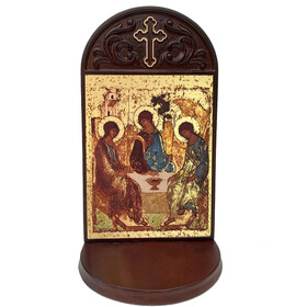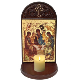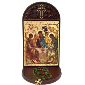 SHMTMS Holy Trinity Icon Silkscreen on Cotton Canvas - Gold Gilded Byzantine Greek Icon in Wooden Shrine With Rosary, Candle and Holy Water Bottle Holder 8 1/2 inch tall